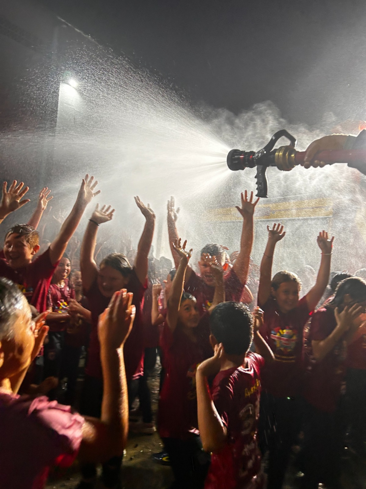 Encerrando a noite com alegria, os novos Bombeiros Mirins participaram do tradicional e tão esperado banho com o caminhão dos bombeiros, momento que simboliza descontração e celebração coletiva após um ciclo de aprendizado.
