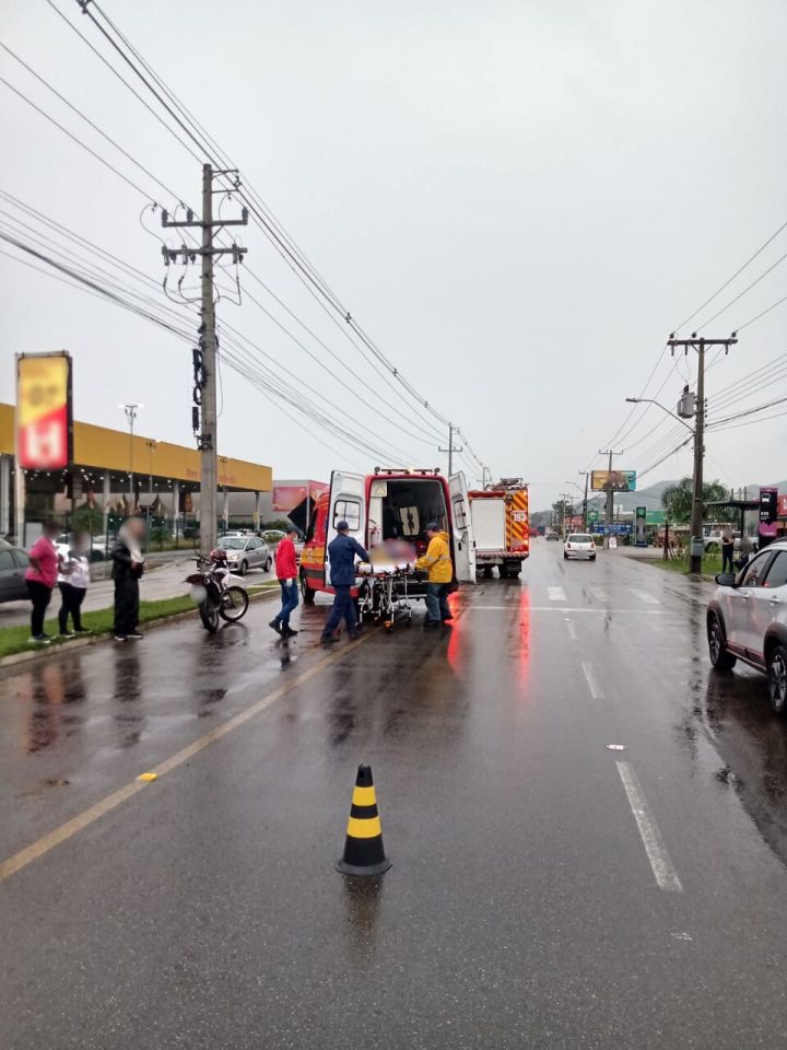 A vítima, uma mulher adulta, estava consciente, com sinais vitais estáveis, mas relatava forte dor na região das costas após ser atingida por uma motocicleta. Após os primeiros atendimentos, ela foi encaminhada para o Hospital Governador Celso Ramos.