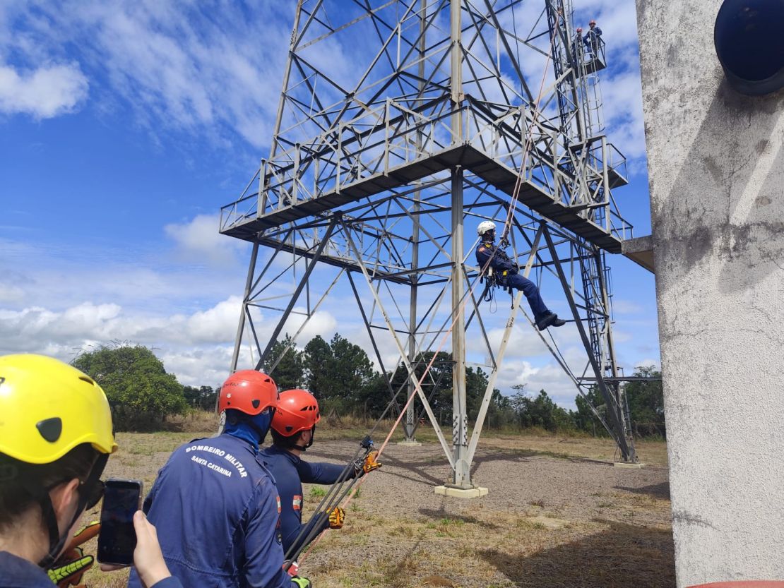 Como encerramento do treinamento, foi realizada uma descida de rapel em uma torre com aproximadamente 76 metros de altura, atividade que exigiu elevado nível de concentração, técnica e confiança nos equipamentos e nos procedimentos adotados.